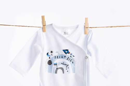 1. BODY BENKICA: Body benkica s dugim rukavima je praktičan i udoban komad odjeće koji se kopča na prednjoj strani i u području međunožja kako bi se olakšalo oblačenje i skidanje. Izrađena od mekanog i prozračnog jersey materijala, body benkica pruža bebi udobnost i slobodu pokreta. Boje koje koristimo za print na bodijima posjeduju certifikat Oeko-Tex® Standard 100. Print na bodiju ulazi u samo tkanje i zbog toga nema nikakve razlike na opip između nježnog materijala i printa, te je zbog visoke kvalitete printa moguće pranje na višim temperaturama u perilici rublja i sušenje u sušilici. Izrađena je od 100% organskog pamuka.