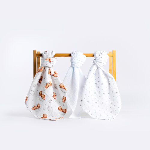 Ethereal.hr » Shop » Set dječjih tetra pelena muslin premium 65x65cm u poklon kutiji – Set 3/1 – Uspavani medo – plavi